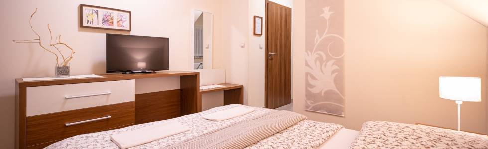 Spacious room with balcony, a TV, hall and its own bathroom. There are two separate beds.